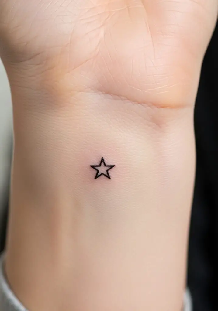 One small star, either a simple five-pointed star or a more detailed compass star. Minimal, clear, and holds its form at tiny scale. A star on the inner wrist that you look at when you need direction, literal or otherwise.
