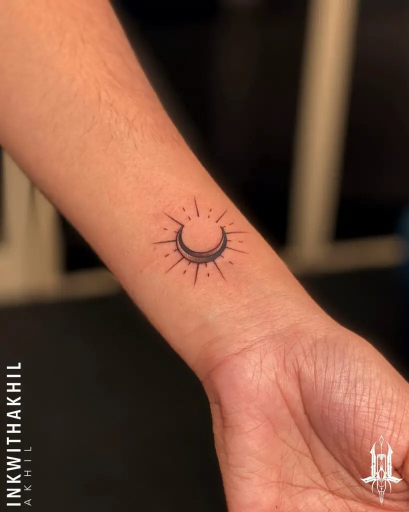A small crescent moon on the inner wrist. The crescent is one of the most reliable small wrist designs because its curved form suits the placement’s scale and the symbolism carries across many personal interpretations: femininity, cycles, intuition, the pull of natural forces.