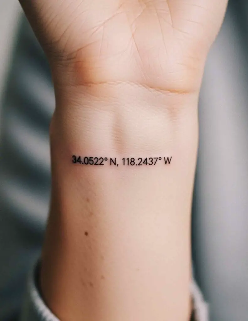 GPS coordinates for a meaningful location in small clean text. The family home, a place that changed something, the coordinates of a birth city. Text coordinates on the inner wrist hold well when the font has sufficient weight and the artist has calibrated the spacing for the small scale.