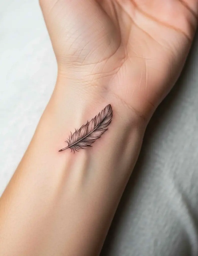 A small feather in fine line, the barbs rendered in delicate detail by an artist who works in micro tattooing. The feather associates with lightness, freedom, and the connection to something beyond daily material concerns. On the inner wrist, it is a constant reminder of whatever those associations mean to the wearer.