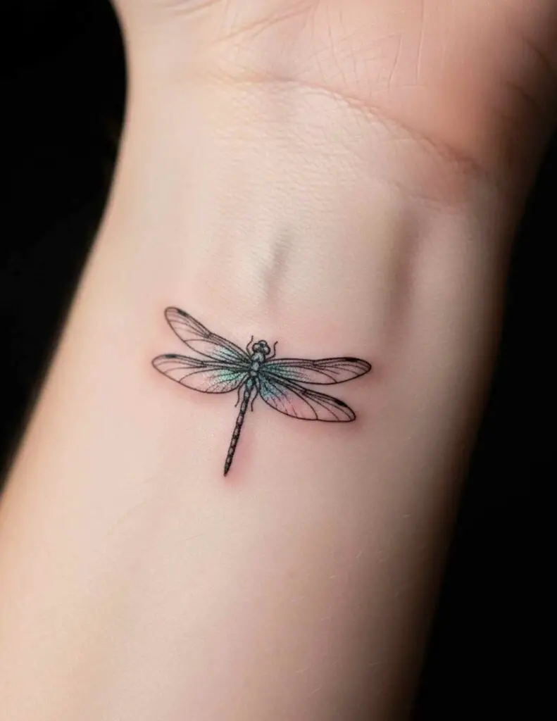 A tiny dragonfly in fine line, the four wings rendered in delicate detail at small scale. The dragonfly carries associations with change, adaptability, and the lightness that comes from understanding that most things are transient. On the inner wrist it becomes a daily reminder of that quality.