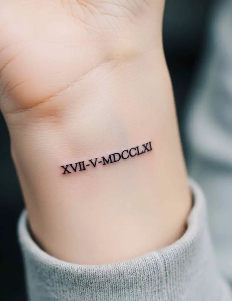A significant date in Roman numerals, small enough for the inner wrist. Birth dates, anniversaries, the dates that define a personal history. Roman numerals hold their legibility at small scale better than many decorative scripts, making them a reliable choice for wrist text work.