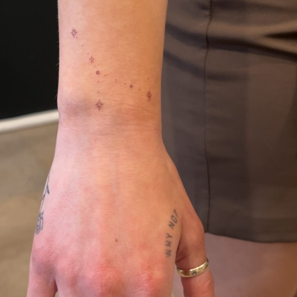 Your birth constellation in dot-and-line form, compact enough for the inner wrist. The constellation is personal, subtle, and carries the celestial associations of the night sky without requiring anything larger than a few centimetres of skin.