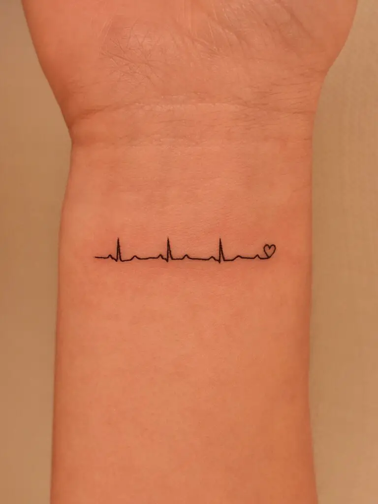 A simple ECG heartbeat line: the flat line, the spike, the return. On the inner wrist directly above where a pulse would be felt, this design carries a specific and direct meaning. Alive, and the mark to prove it.