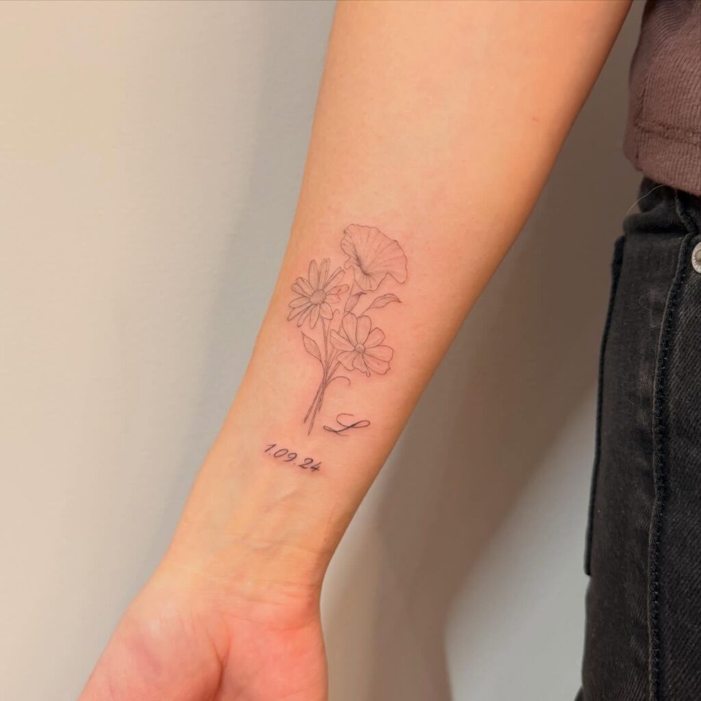 One small flower in fine line: a daisy, a rose bud, a poppy. The simplicity of a single flower at small scale is the point. The wrist is where you look when you check the time, when you reach for something, when you are sitting quietly. A small flower here becomes part of daily life without demanding attention.