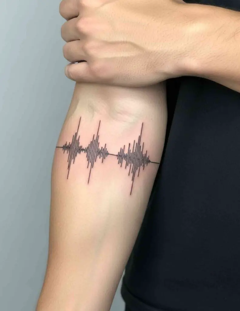 The actual waveform of a specific sound: a voice, a piece of music, a word spoken by someone who matters. Audio software can generate a visual waveform from any recording. That waveform tattooed on skin is entirely yours. The sound exists on your body in visual form.