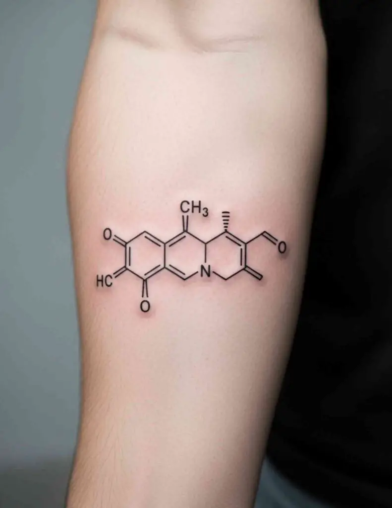 The molecular structure of something personally meaningful: the chemical composition of a specific compound, a neurotransmitter, or the structure of a substance that has been significant in your life. Molecular diagrams have a visual clarity and specificity that makes them highly readable as tattoo designs.