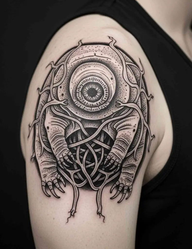 A scientifically accurate illustration of a specific organism only visible under a microscope: a tardigrade, a radiolarian, a diatom. These creatures have extraordinary forms that most people never see. Bringing one to visible scale on skin is a genuinely original concept.