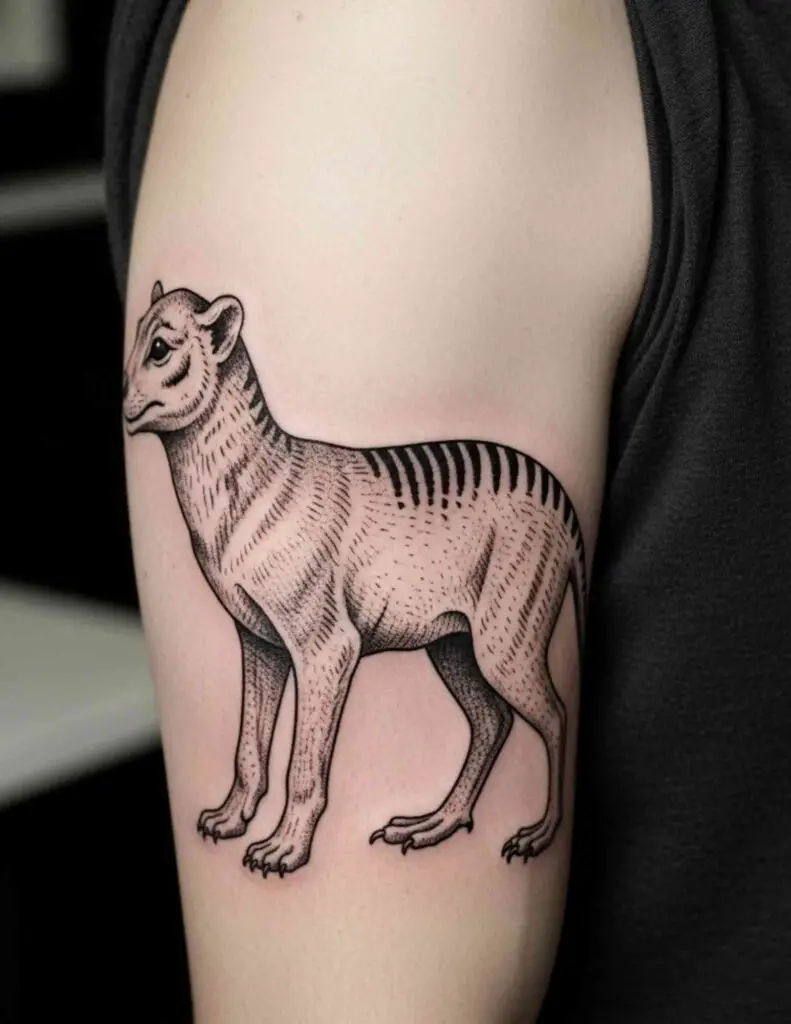 A scientifically accurate rendering of an extinct species: a thylacine, a dodo, a woolly rhinoceros, or a deep-time species like an anomalocaris. The choice of an extinct animal carries symbolism about impermanence and loss without the design ever having to explain itself.