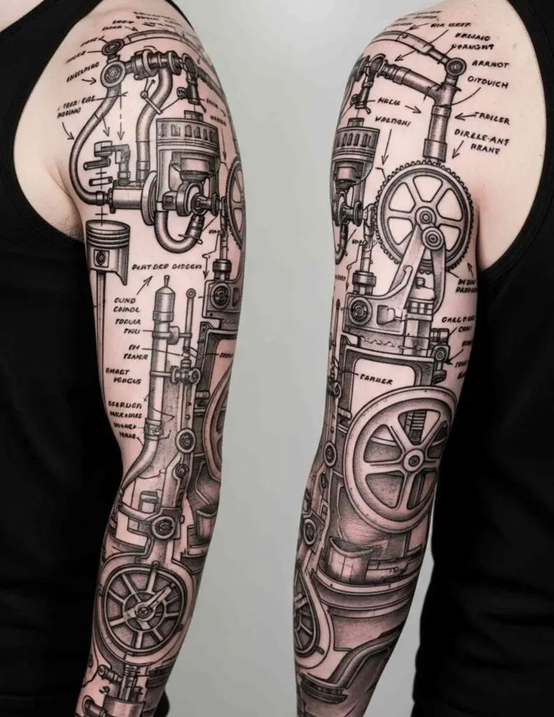 The technical illustration of a specific machine or mechanism: a Victorian steam engine, a clockwork movement, an early aircraft engine. The complexity and precision of mechanical technical drawing produces extraordinary tattoo material. For men interested in engineering or mechanical history, the subject is specific and the style is compelling.