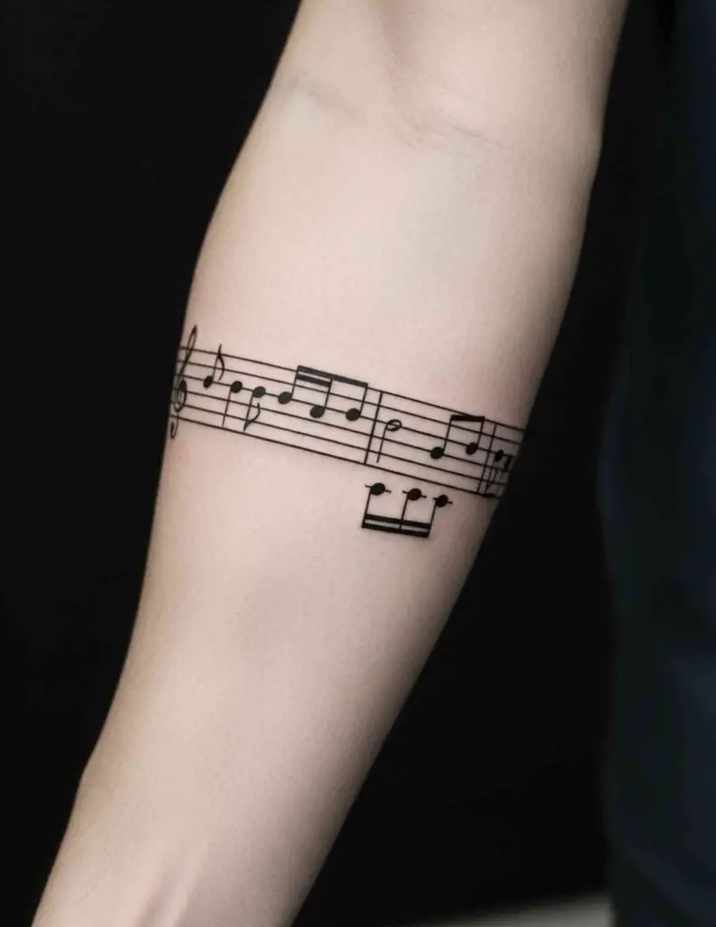 Not a generic music note symbol. The actual notation from a specific bar of music that matters to you: the opening of a piece, the bar where something changes, the four beats that contain a specific memory. Sheet music notation as tattooed art has a formal elegance that standard music imagery does not.
