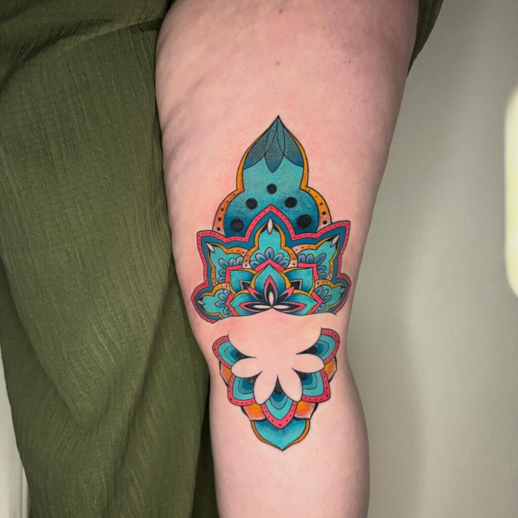 The contrast between hard geometry and soft color is what makes this style so striking. Large mandalas work especially well on the back, thigh, or chest, where their circular symmetry can be fully displayed. This tattoo appeals to those who appreciate both meticulous artistry and spiritual symbolism.