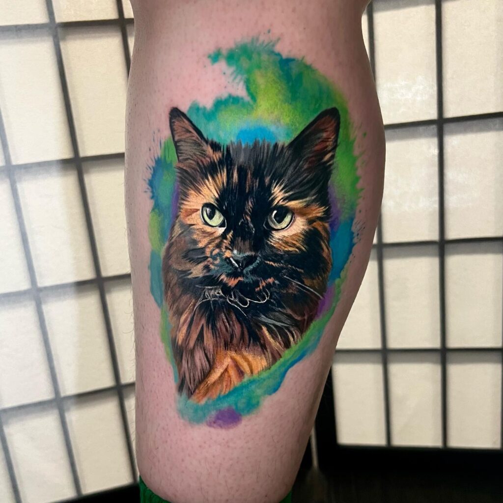 Common choices include wolves, foxes, lions, and domestic cats or dogs, each lending itself beautifully to the vibrant color palette of watercolor. The portrait can be framed with paint splashes and drips to reinforce the artistic medium. Placed on the upper arm, thigh, or chest, a watercolor animal portrait becomes a deeply personal and visually striking piece.