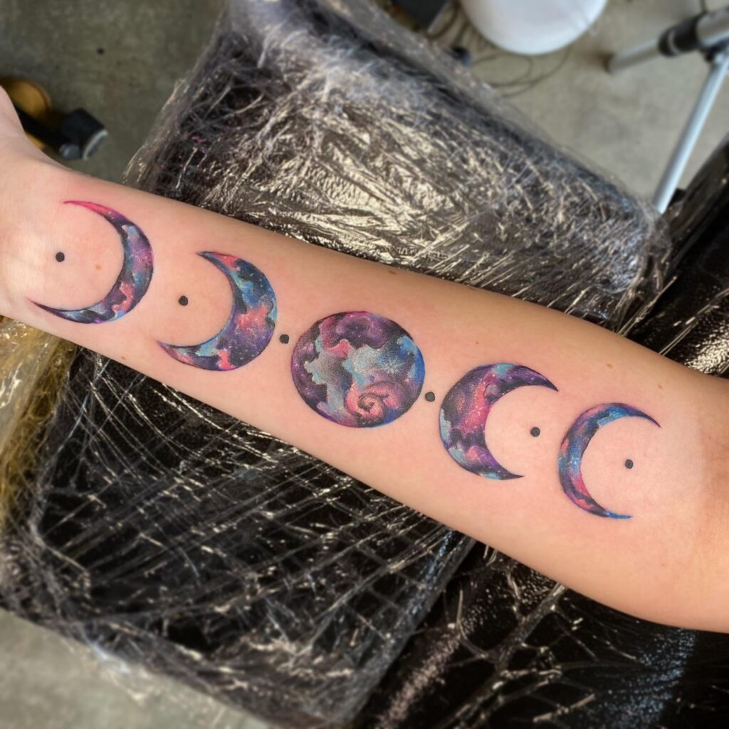 Delicate color washes between the phases tie the design together into one cohesive, flowing composition. This tattoo style is a perfect fit for a long, horizontal placement like the collarbone, forearm, or spine. Moon phase tattoos resonate especially with those who are drawn to astrology, femininity, and the rhythm of natural cycles.