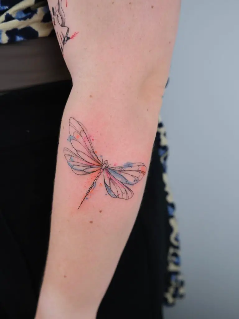 Delicate color splashes around the wings create the impression that the dragonfly has just landed on your skin. This design is popular on the forearm, shoulder, or ankle, where the dragonfly’s horizontal wingspan can be displayed elegantly. Beyond aesthetics, the dragonfly carries symbolism of transformation and living in the present moment.