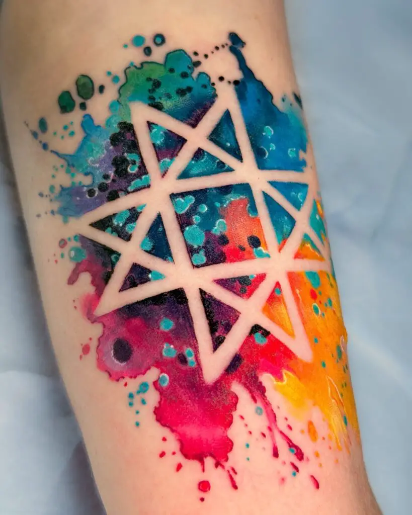 Geometric watercolor tattoos use crisp line art like triangles, hexagons, or abstract polygons, as a container for vibrant watercolor splashes that bleed beyond the edges. The sharp angles of the geometry contrast beautifully with the softness of the paint, creating a design that feels both structured and free.