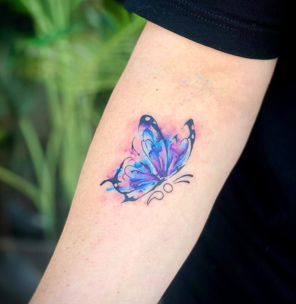 A butterfly rendered in watercolor is one of the most beloved designs in this style because its wings provide the perfect canvas for flowing color. Artists typically blend purples, teals, and pinks to create wings that look as if they’ve been touched by a paintbrush mid-flight.