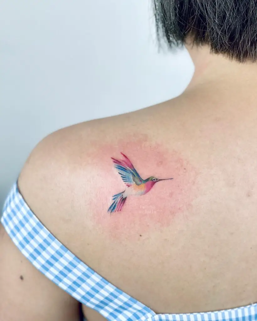 Hummingbirds are one of nature’s most colorful creatures, making them an ideal subject for the watercolor tattoo style. Artists capture the bird’s wings mid-beat, blending iridescent greens and ruby reds to match the real bird’s spectacular plumage.