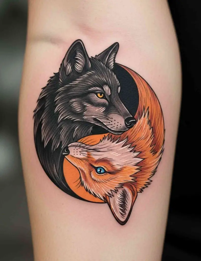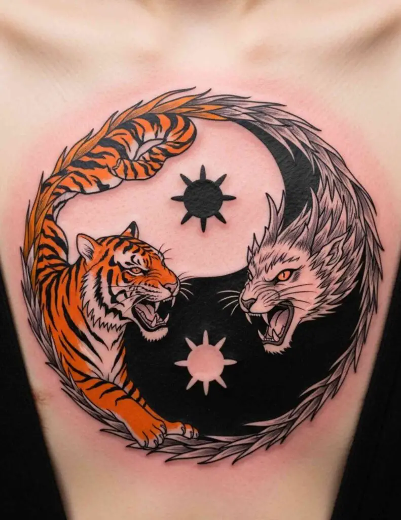 One half contains an animal associated with one quality, the other half a contrasting animal. A sun and a moon animal. A wolf and a fox. A tiger and a dragon. The animals carry the yin yang’s duality in a more narrative and personal way than the abstract symbol alone.