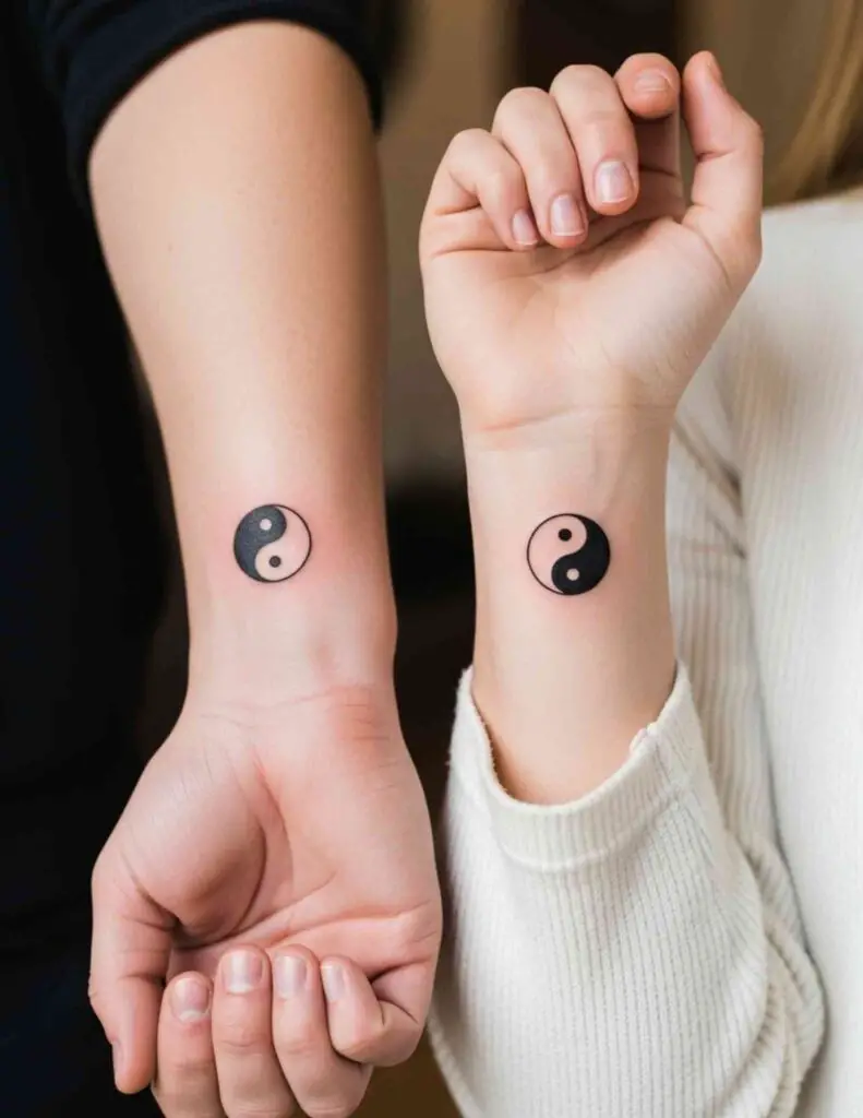 Each partner wears one half. The tattoos are complementary rather than matching: one the yin, one the yang. Together they form the complete symbol. Apart, each is half of something. A couples tattoo that says more about complementarity and necessary difference than any heart or matching design.