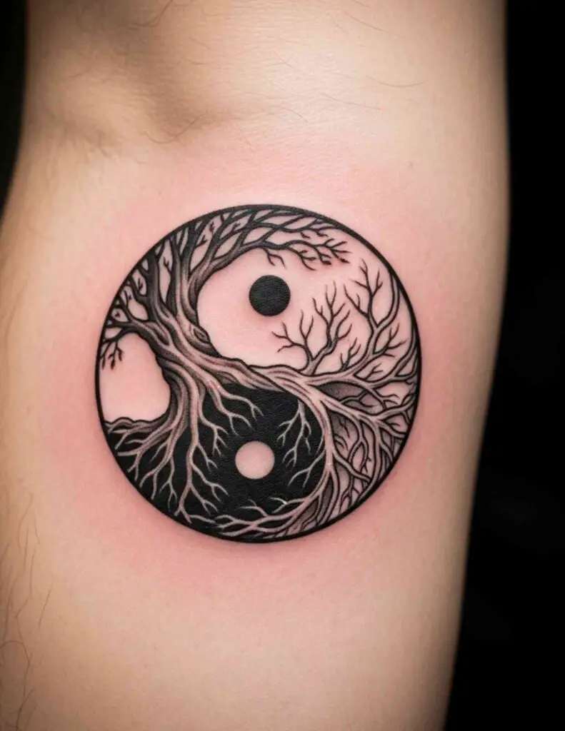 A large yin yang in solid blackwork, the white half left as skin, the black half filled in solid. The graphic contrast at scale is striking. Placed on the chest or upper back, a blackwork yin yang has genuine presence.